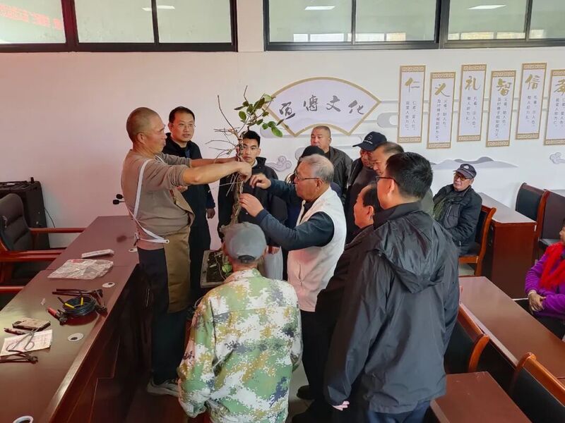 除了干货满满的讲座,还有实践演练环节。席师傅现场示范了盆景制作的核心步骤,从选桩、修枝、蟠扎到上盆,每一个动作都娴熟流畅,讲解细致入微。“这枝要斜着剪,留三分长势才好看!”他一边操作,一边强调关键技巧,还不时停下来纠正村民们的错误手法。村民们热情高涨,纷纷拿起工具,在席师傅的指导下动手尝试。有的村民小心翼翼地修剪着枝干,有的专注地调整着盆景的造型,遇到问题随时请教,现场学习氛围十分浓厚。