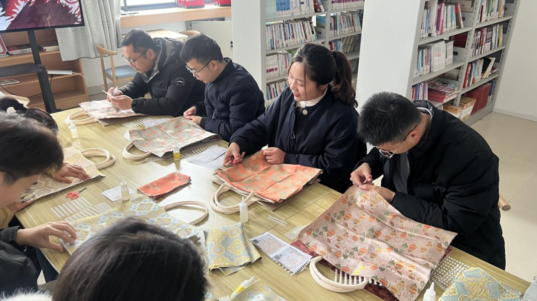 在手工制作环节,老师详细演示了宋锦面料与帆布包的搭配技巧、基础针法和面料处理方法。参与者们手持针线,将裁剪好的宋锦面料精心固定在帆布包上,再搭配珍珠等配件,一步步完成个性化的宋锦包袋制作。穿针引线间,传统宋锦纹样与现代帆布包巧妙融合,变成了兼具美感与实用性的手作作品。